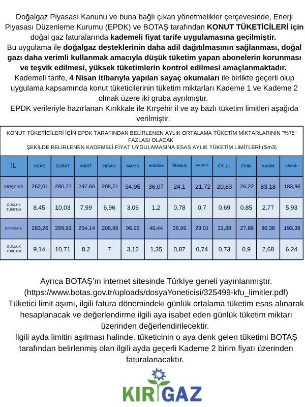 BOTAŞ tarafından 4 Nisan 2026 tarihinden geçerli olarak yayınlanan doğal gaz satış tarifesi kapsamında, EPDK ve BOTAŞ tarafından yapılan düzenlemeler çerçevesinde doğal gaz tarifelerinde konut tüketicileri için kademeli tarife uygulamasına geçilmiştir.